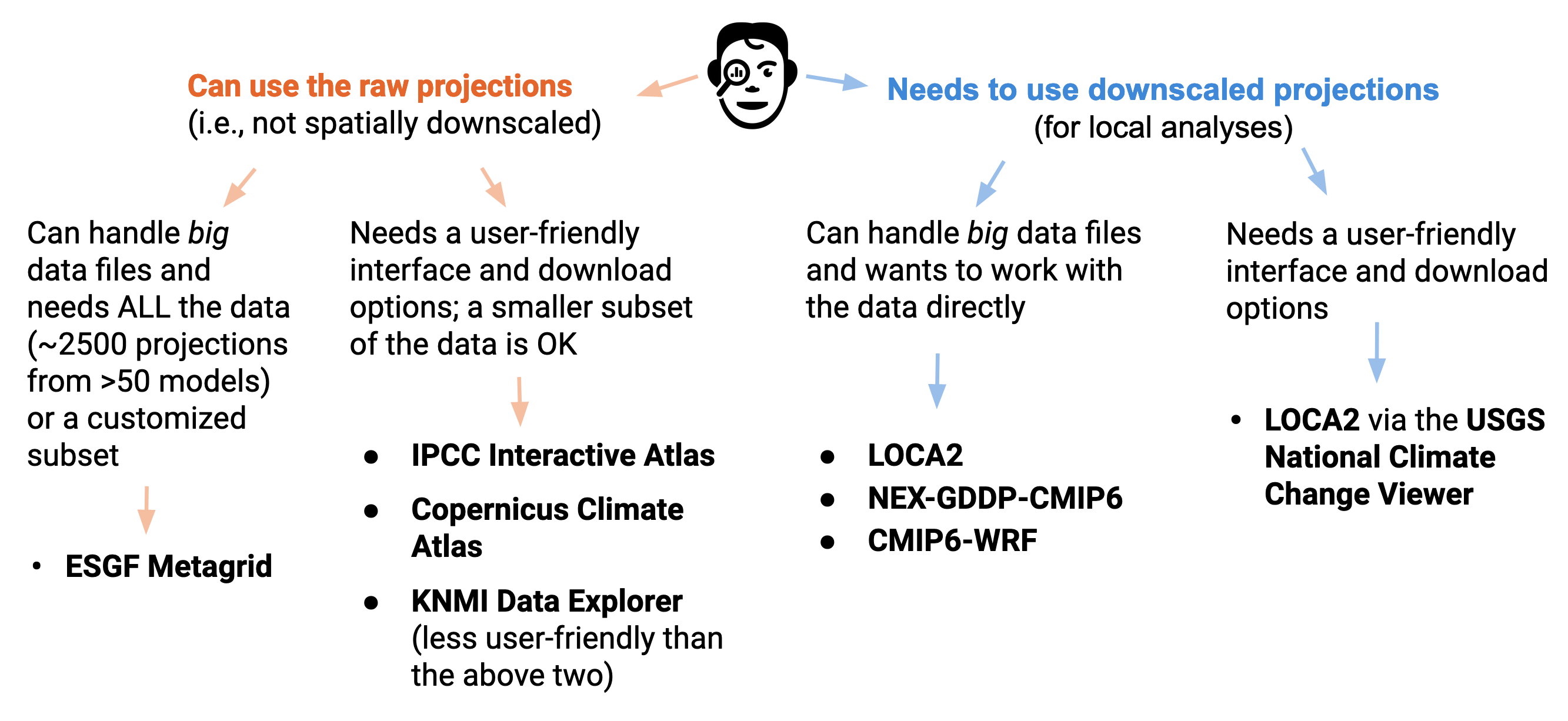 Figure 10.1. Schematic showing selected CMIP6 datasets that are currently available as of Fall 2024, as matched with user needs and characteristics. See “Long answer” below for more details and links to these datasets.