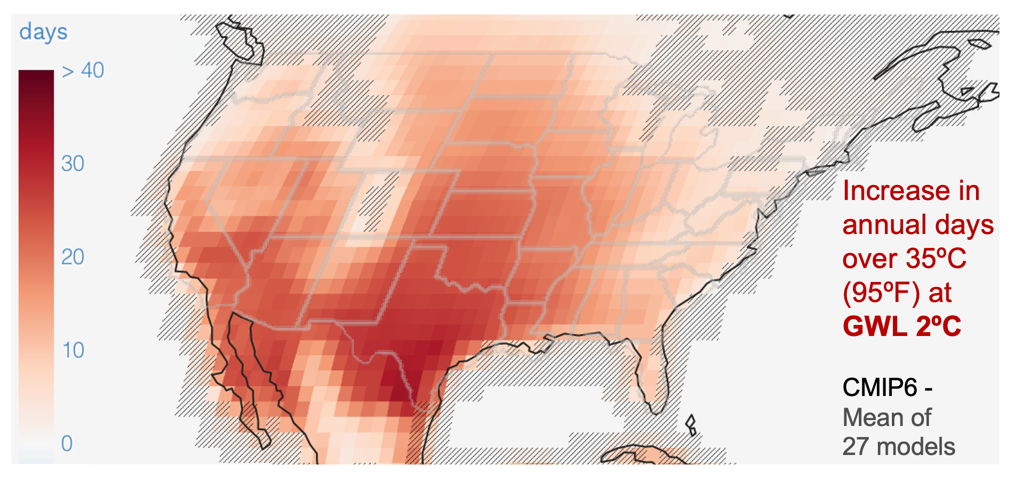 Figure 6.1. Example of a Global Warming Level (GWL) analysis: Projected future increase in the number of days per year over 35°C (95°F) at a GWL of 2°C, based on the mean projection from 27 CMIP6 models. (Source: Modified from IPCC WGI Interactive Atlas)